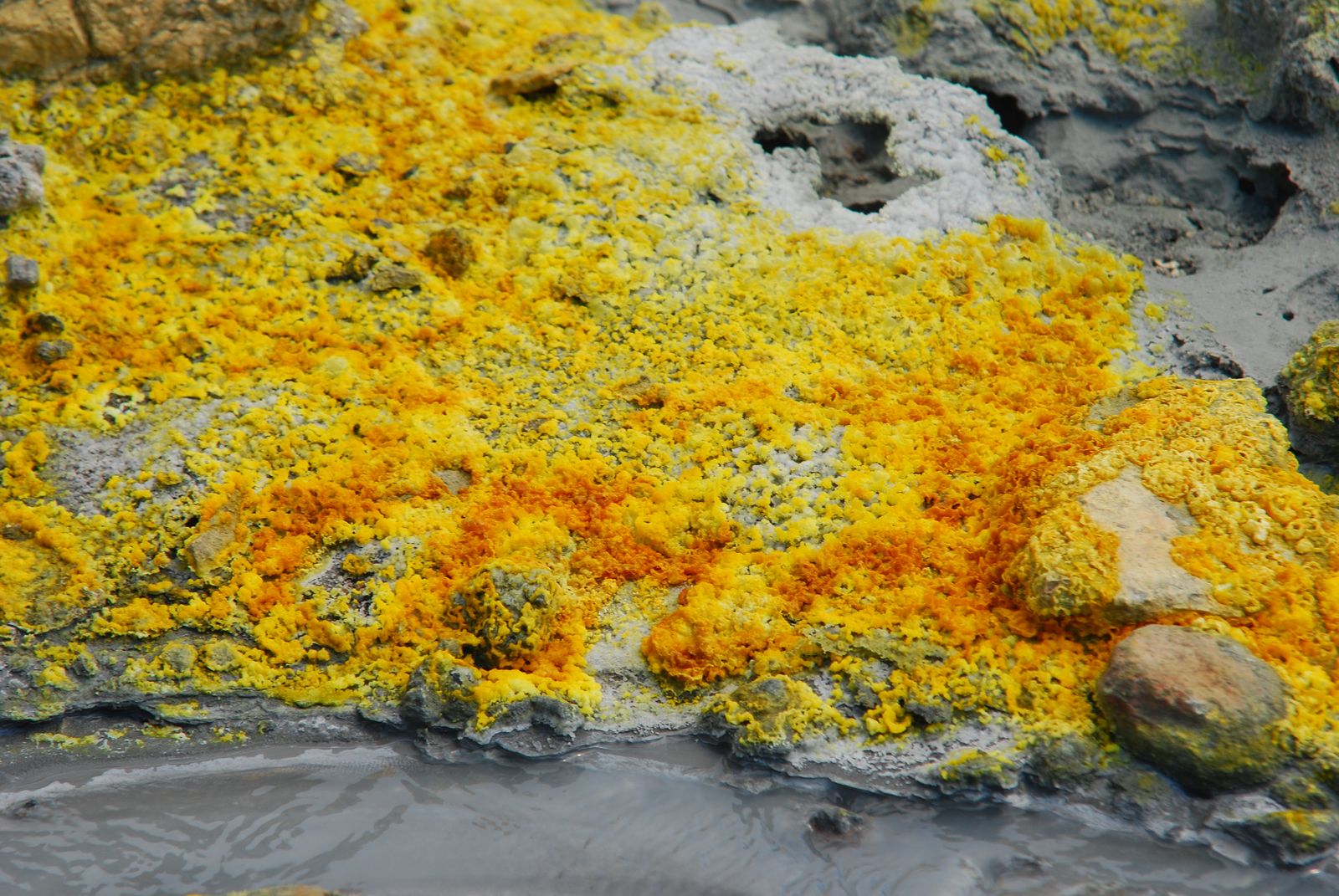 stále z něj uniká horká pára a sirné sopečné plyny, které místy tvoří